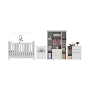 Produzido em MDP/MDF com acabamento acetinado (cerca de 20% de brilho), este conjunto garante durabilidade e resistência. O guarda-roupa dispõe de 4 portas, prateleiras, cabideiro e 3 gavetas. Já a cômoda conta com 1 porta com cabideiro para roupas curtas e 4 gavetas espaçosas, oferecendo excelente capacidade de organização para roupas e acessórios do bebê. As corrediças metálicas oferecem leveza ao abrir e fechar as gavetas. Detalhes nas portas em vidro incolor adicionam um toque de charme ao conjunto. Para segurança extra, ambos acompanham um sistema antitombamento. Os pés em polipropileno e os puxadores em ABS redondos propõem estabilidade e delicadeza.