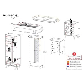 Os produtos serão entregues desmontados e não disponibilizamos o serviço de montagem. Acabamento: Pintura UV | Tonalidade: Branco | Material: MDF | Referência do Modelo: MP4333 | Coleção: Doçura | Sistema de Montagem: O produto acompanha manual de montagem juntamente com kit ferragem. O produto será entregue desmontado e não disponibilizamos o serviço de montagem. | Instruções de Cuidado: Limpar com pano seco para retirar o pó. Não utilizar produtos químicos ou abrasivos. Não aplicar lustra móveis. | Produto Composto por: 1 cama, 1 colchão, 1 guarda-roupa, 1 cômoda, manual de montagem e kit ferragem. | Altura Montado: | Largura Montado: 80 | Profundidade Montado: | Tamanho (L x A x P): 80 x 202,5 x 44,5 | Peso do Produto: 132 | Corrediça: Telescópica | Inclui Berço: Não | Acompanha Colchão: Sim | Inclui Guarda-Roupa: Sim | Inclui Gaveteiro: Não | Material do Puxador: ABS | Quantidade de Portas: 2 | Quantidade de Gavetas: 4 | Quantidade de Puxadores: 10 | RBN: 17352335011 | Quantidade de Pés: 10 | Quantidade de Peças: 3 | Material dos Pés: Polipropileno | Produto: Conjunto de Quarto | Portátil: Não | Registro INMETRO: N/A | Fabricante: Multimóveis | Regulamentado pelo INMETRO: Não | Garantia do Fabricante: 3 | Requer Montagem: Sim | Altura do Produto com Embalagem: 61 | Largura do Produto com Embalagem: 90 | Comprimento do Produto com Embalagem: 195 | Peso do Produto com Embalagem: 132 | Nome do Produto no Fornecedor: Quarto Infantil Completo com Colchão Incluso Doçura Multimóveis MP4333 Branco/Cinza/Rosa | Estado de Origem: RS | Produto precisa de Montagem?: Sim | Tempo de Garantia: 3 meses | Descrição do Tamanho: L x A x P: 80 x 202,5 x 44,5 cm | Tipo de cama: Solteiro | Marca: Multimóveis | Tamanho da cama: Solteiro | Quantidade de mudos: 0 | Tipo de madeira: MDF | Comprimento da cama: 193 cm | Altura da cama: 83 cm | É Kit de fábrica: Sim | Estilo: Moderno | Largura da cama: 85 cm | Idade recomendada: 5-7 anos | Idade: Crianças | Quantidade de caixas de embalagem: 06 | Destaque 1: Produzido em MDF: maior durabilidade e resistência. | Destaque 2: Acompanha colchão D20 antiácaro e antialérgico. | Destaque 3: Pés retrô em polipropileno e puxadores em ABS: promove estabilidade e facilidade no manuseio. | Destaque 4: Guarda-roupa conta com um cabideiro incluso. | Destaque 5: Tamanho do produto montado (L x A x P): 80 x 202,5 x 44,5 cm | Tipo de Material: Madeira | Baterias são necessárias?: Não | Certificação de teste externa: N/A | Is Fragile: Sim | Dimensões do item P x L x A: | Quantidade de itens: 1 | da peça: | Peso do pacote: 132 Quilogramas Cor: Branco/Cinza/Rosa