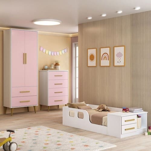 O Quarto Infantil Completo Magia é um conjunto encantador composto por um guarda-roupa, uma cômoda e uma cama montessoriana. Todos os móveis são construídos com materiais duráveis, apresentando uma estética sofisticada. O conjunto oferece um amplo espaço interno com detalhes cuidadosamente trabalhados, incluindo corrediças telescópicas suaves, puxadores elegantes e um interior moderno com uma pintura UV fosca. A montagem é simplificada com instruções detalhadas, e a embalagem garante a segurança das peças durante o transporte. Este conjunto transforma o quarto em um espaço magico de imaginação para as crianças. Possui Rodízio: Não Acompanha Colchão: Não Altura do Conjunto: 195 cm Ambiente: null Ambiente Principal: Quarto Infantil Cor: Branco/Rosa Informação Complementar: 1x Cama Infantil Montessoriana Solteiro Miguel Branco Largura: 164,3 cm Altura: 38,5 cm Peso: 43,98 kg Profundidade: 74 cm Necessita Montagem: Sim
