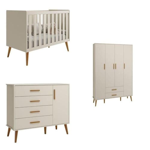 O Conjunto Isis é uma excelente opção pra quem procura por qualidade, beleza e praticidade. Seus pés retro em madeira dão charme e elegância ao produto. O berço possui 3 posições de estrado, acompanha suporte para mosquiteiro e ainda se transforma em uma linda mini cama. A comoda possui 4 gavetas espaçosas, uma sapateira com prateleira, corrediças telescópicas e puxadores em madeira. O roupeiro possui gavetas espaçosas, portas, cabideiro, prateleiras, corrediças telescópicas e puxadores em madeira.