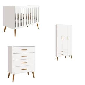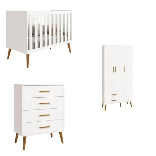 O Conjunto Isis é uma excelente opção pra quem procura por qualidade, beleza e praticidade. Seus pés retro em madeira dão charme e elegância ao produto. O berço possui 3 posições de estrado, acompanha suporte para mosquiteiro e ainda se transforma em uma linda mini cama. A comoda possui 4 gavetas espaçosas, corrediças telescópicas e puxadores em madeira. O roupeiro possui gavetas espaçosas, portas, cabideiro, prateleiras, corrediças telescópicas e puxadores em madeira.