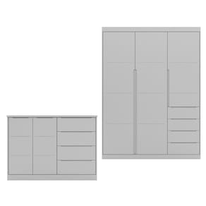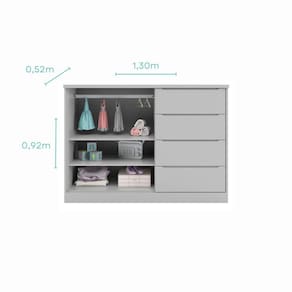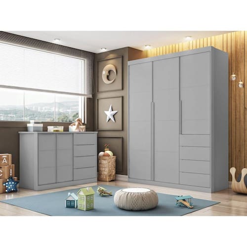 Conta com 3 portas e 4 espaçosas gavetas que deslizam suavemente devido a tecnologia das corrediças telescópicas, sem falar do sistema de travas de segurança que é acionada após a sua abertura completa. Os puxadores em modelo cava são embutidos e dificultam o acesso do bebê. Já as prateleiras são removíveis, auxiliando a mamãe a organizar da melhor forma que preferir. Para manter as roupinhas que são mais utilizadas, com praticidade, os cabideiros inclusos contribuem perfeitamente. Acabamento da Gaveta: Pintura UV Acabamento da Porta: Pintura UV Acompanha Manual de Instalação: Sim Acompanha Suporte para Mosquiteiro: Não Ambiente Principal: Quarto de Bebê Certificado: Não se aplica codigo_ean: 7909903407202 Complexidade da Montagem: Baixa: pode ser montado por uma pessoa sozinha Cor: Cinza Cor do Produto: Cinza Cor Flex: não Cor Interna: Cinza Escala de Brilho: Semi-brilho Escala de Brilho da Gaveta: Semi-Brilho Escala de Brilho da Porta: Semi-Brilho Escala de Brilho da Prateleira: Semi-Brilho Estampado: Não Estrado com Regulagem de Altura: Não Estrado Regulável em Quantas Posições: 02 Linha ou Coleção: Classica Manual de Montagem e Instalação: https://product-hub-prd.madeiramadeira.com.br/867309/documents/0a619716-671c-479b-becf-4b2ab0693ab41493605conjperola.pdf Material da Gaveta: MDF Material da Porta: MDF Material da Prateleira: MDF Material do Estrado: MDF Material do Fundo: MDF Material Principal: MDF Medida de Cada Item: Roupeiro 220x165x52 ; Cômoda 92x130x52 Montagem Flex: não Necessita Montagem: Sim Origem do Produto: Nacional Permite a Utilização de Cama Auxiliar: Não Peso: Guarda Roupa 158,65 ; cômoda 63,90 Peso de Cada Item: Guarda Roupa 158,65 ; cômoda 63,90 Pintura Atóxica: Sim Possui Certificado: Não Possui Gavetas: Sim Possui Grade: Não Possui Portas: Sim Possui Prateleiras: Sim Possui Rodízio: Não Quantidade de Gavetas: 08 Quantidade de Portas: 05 Quantidade de Prateleiras: 13 Recomendações de Uso, Manutenção e Limpeza: Pano seco Sistema de Montagem: acompanha manual Tipo de Corrediça da Gaveta: Metálica Telescópica Tipo de Dobradiça/Corrediça da Porta: Metálica Tipo de Guarda-Roupa: Bebê Tipo de Porta: Bater Tipo de Puxador da Gaveta: Embutido Tipo de Puxador da Porta: Embutido undefined: 867364 Ean: 7909903407202