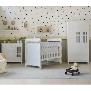que tal o quarto infantil ariel?seu bebê merece um espaço mobiliado com todo o carinho e atenção, por isso o quarto ariel é ideal para acompanhar a rotina e crescimento dele. composto por 1 berço onde ele vai recarregar as energias, 1 cômoda e 1 guarda-roupa com compartimentos para que as roupinhas, itens pessoais e até brinquedos fiquem bem armazenados, esse kit atende a todas as necessidades da criança e, claro, das mamães e papais. outro fator importante é o design leve e delicado das peças que, aliado à cor branca, oferece um visual fácil de incorporar à decoração, permitindo que você brinque com tonalidades e estampas. ah, para deixar o combo ainda mais funcional, o berço pode se transformar em uma minicama, bastando pequenos ajustes para que ele possa fazer parte também dos estágios mais avançados da infância - os rodízios precisam ser substituídos pelos pés fixos, como mostra a imagem, tá? pronto! o cantinho de descanso e desenvolvimento do seu filho não poderia ficar mais completo ;)