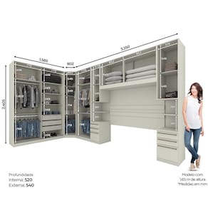 ESPECIFICACOES TECNICAS: Qtd. Portas: 11 Und. Tipo Porta: Bater/Correr Material da Porta: MDP Tipo de Puxador da Porta: Externo Material do Puxador Porta: Aluminio Tipo de Dobradica: 35mm Soft Close Qtd. Gavetas: 9 Und. Material da Gaveta: MDF/MDP Tipo de Gaveta: Interna/Externa Material da Corredica: Metalica Telescopica Material do Puxador Gaveta: Aluminio Peso Maximo por Gaveta: 3 Kg Possui Organizador de Gaveta: Nao Possui Espaco para Vestidos Longos: Sim Possui Ganchos: Nao Possui Iluminacao Led: Nao Possui Maleiro: Sim Possui porta Objetos: Nao Qtd. Prateleiras: 14 Und. Material da Prateleira: MDP Peso Maximo por Prateleira: 8 Kg Nicho com Cabideiro: Sim Possui Cabideiros e calceiros: 3 Und.3 Und. Possui Espelho ou Vidro: Nao Tipo Roupeiro: Modulado Quantidade de Pecas: 6 Und. Modular: Sim O Modulo Pode ser Utilizado Individualmente: Sim Medidas Montado -A x L x P-: 240,5 x 406,5 x 54cm Peso Produto Montado -Kg-: 139Kg Produto Suporta ate -Kg-: 90 Kg Informacoes Complementares: Gavetas com corredicas telescopicas Puxadores, cabideiros e calceiros em aluminio Material Principal: MDP