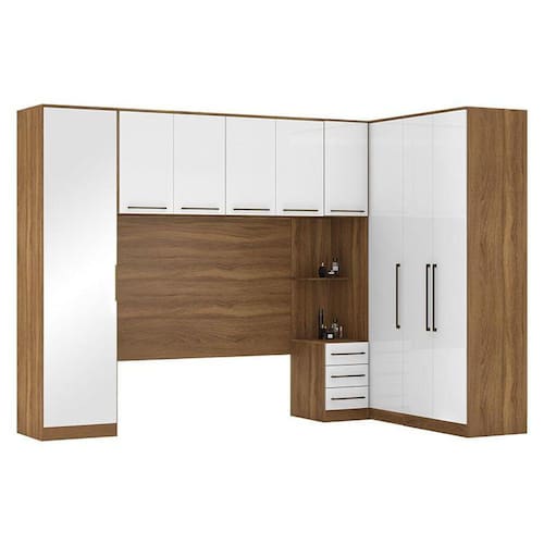 Quarto Modulado Casal Irlanda Composição 3 - Demartêz Se você está procurando algo para otimizar espaço no seu quarto, o Modulado Irlanda é uma de suas melhores opções. Com ele você adquire módulos para organizar suas roupas e calçados, além de acessórios. Toda a linha Irlanda proporciona versatilidade e usabilidade ao permitir diferentes formatos para a montagem do dormitório. Os módulos são produzidos em MDP de alto padrão, com acabamento em pintura UV e puxadores metálicos na cor bronze, a linha é resistente e solução ideal para quaisquer dimensões de espaço.