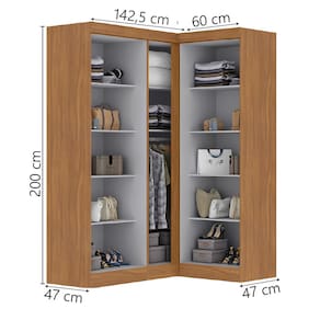 MEDIDAS LADO ESQUERDO: A = 200 cm L = 142,5 cm P = 47 cm MEDIDAS LADO DIREITO: A = 200 cm L = 60 cm P = 47 cm PESO: 122,70kg PESO SUPORTADO ATÉ: 112kg PRATELEIRAS SUPORTAM ATÉ: 6kg CADIDEIROS SUPORTAM ATÉ: 12kg MODELO: Quarto Modulado de Canto Madrid com 5 Portas MARCA: Maxel MATERIAL DA ESTRUTURA: MDP ESPESSURA DO MATERIAL DA ESTRUTURA: 12mm TIPO DE PINTURA: Verniz alto brilho ACABAMENTO: Texturizado PORTAS: 5 TIPO DE PORTA: Bater CABIDEIROS: 1 MATERIAL DO CABIDEIRO: Madeira DOBRADIÇAS: Metálicas PUXADOR: Plástico PRATELEIRAS: 9 PÉS: Não possui DIFERENCIAL: Amplo espaço de armazenamento, acabamento em verniz texturizado e verniz brilho nas portas, produto versátil. ITENS INCLUSOS: 1 Modulo de Canto, 2 Modulos Guarda Roupas, 1 Manual de Montagem, 1 Kit Parafusos INSTRUÇÕES E CUIDADOS: Para maior durabilidade, recomendável que a limpeza dos móveis seja feita com pano limpo e levemente umedecido em água e sabão neutro. Em seguida, deverá ser passado um pano limpo e seco OBS: Você pode montar o módulo em ambos os lados GARANTIA: 3 meses