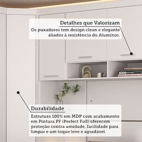 Caracteristicas: Estrutura: 100 MDP Acabamento: Perfect Foil -PF- Quantidade de Portas: 8 de Bater Quantidade de Gavetas: 6 Tipo de Corredicas: Telescopica Tipo de Cabideiros: 1 em Aluminio Tipo de Puxador: Aluminio Tipo de Pes: Rodape Sistema de Montagem: Cavilhas, Parafusos e Minifix Garantia: 3 meses