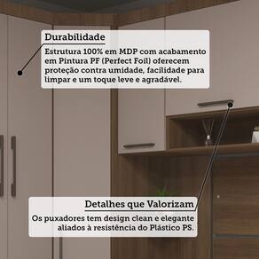 Caracteristicas: Estrutura: 100 MDP Acabamento: Perfect Foil -PF- Quantidade de Portas: 9 Tipo de Abertura das Portas: 7 de Bater e 2 Basculantes Quantidade de Gavetas: 6 Tipo de Corredicas: Telescopica Tipo de Cabideiros: 2 em Aluminio Tipo de Puxador: Plastico PS Tipo de Pes: Rodape Sistema de Montagem: Cavilhas, Parafusos e Minifix Garantia: 3 meses