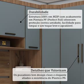 Caracteristicas: Estrutura: 100 MDP Acabamento: Perfect Foil -PF- Quantidade de Portas: 8 Tipo de Abertura das Portas: 6 de Bater e 2 Basculantes Quantidade de Gavetas: 6 Tipo de Corredicas: Telescopica Tipo de Cabideiros: 1 em Aluminio Tipo de Puxador: Plastico PS Tipo de Pes: Rodape Sistema de Montagem: Cavilhas, Parafusos e Minifix Garantia: 3 meses