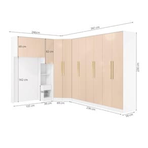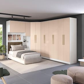 Para quem sempre sonhou com um quarto planejado, o Modulado Adapt da Kappesberg é a escolha certa. Produzido em MDP de 15mm, o que proporciona mais robustez, firmeza e qualidade, o Combo CB1163 conta com seis peças, sendo a composição perfeita para todos os ambientes, garantindo o espaço ideal para organizar roupas e calçados com beleza e funcionalidade. Unindo peças curingas e muito versáteis, os módulos são individuais, permitindo a montagem conforme o seu espaço e preferência. Com altura de 2,30m e 56cm de profundidade, os módulos contam com amplo espaço e uma ótima divisão interna, com nichos de tamanhos diferentes, ideais para guardar calçados e roupas dobradas. Os cabideiros, metálicos e de suporte interno, permitem organizar peças maiores, como casacos e vestidos sem amassar. Já as gavetas, com corrediças telescópicas, garantem uma melhor otimização de espaço e são perfeitas para acessórios e peças menores, deixando seu quarto sempre organizado. E para um melhor aproveitamento de espaço na vertical, os aéreos são uma ótima opção, permitindo organizar travesseiros e cobertores com facilidade. Com formato em L, o módulo de canto é uma das peças centrais do ambiente, e para noites de sono ainda mais confortáveis, o combo conta com painel e cabeceira estofada, acomodando camas de solteiros, e deixando seu quarto completo. Outros módulos, como a mesa de cabeceira com prateleira tornam o projeto único, garantindo o quarto dos sonhos. E com sete camadas de pintura, tanto na parte interna quanto na externa, a caixaria conta com pintura na cor branca, enquanto que as portas, são na cor macadâmia, ambas com acabamento em brilho. Uma combinação linda e elegante, ideal para quem busca por ambientes diferenciados e com mais luminosidade. Os destaques ficam com o sistema de amortecimento nas portas, garantindo um fechamento suave e sem ruídos, e dos puxadores em MDF na cor dourada, completando os diferenciais do produto e deixando seu quarto do jeito que você sempre sonhou. Renove seu quarto com toda a qualidade e beleza que o Modulado Adapt da Kappesberg oferece e aproveite cada momento.