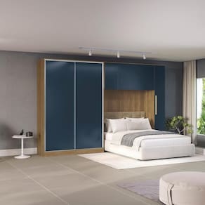 Para quem sempre sonhou com um quarto planejado, o Modulado Adapt da Kappesberg é a escolha certa. Produzido em MDP de 15mm, o que proporciona mais robustez, firmeza e qualidade, o Combo cinco peças CB1164 é ideal para quem busca por funcionalidade e espaço. Modulado, você pode dispor os módulos conforme o seu espaço e preferência. Com 2,30m de altura, os módulos contam com amplo espaço, garantindo organização e beleza. Com ótimas divisões internas, eles possuem nichos de tamanhos diferentes, ideais para guardar calçados e roupas dobradas. Os cabideiros, metálicos e de suporte interno, permitem organizar peças maiores, como casacos e vestidos sem amassar. Já as gavetas, com corrediças telescópicas, garantem uma melhor otimização de espaço e são perfeitas para acessórios e peças menores, deixando seu quarto sempre organizado. Com aéreo e maior espaço na vertical, você organiza cobertas e travesseiros com facilidade. E para deixar seu quarto com cara de planejado, o combo acompanha um painel de acabamento e cabeceira estofada, ideal para camas de casal queen, de 158cm, deixando seus momentos de descanso ainda mais confortáveis. Com sete camadas de pintura, tanto na parte interna quanto na externa, a caixaria conta com pintura touch na cor nogueira, com a textura dos veios da madeira, e as portas, com pintura na cor azul profundo, possuem acabamento fosco. Uma combinação marcante e moderna, que garantirá estilo e aconchego ao espaço, ideal para quem busca por um design único e elegante. O diferencial fica por conta do sistema de amortecimento nas portas, garantindo um fechamento suave e sem ruídos, além de mais durabilidade, e os puxadores, em MDF na cor dourada, completam a beleza do produto, deixando seu quarto do jeito que você sempre sonhou. Renove seu quarto com toda a qualidade e beleza que o Modulado Adapt da Kappesberg oferece e aproveite cada momento.