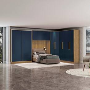 Para quem sempre sonhou com um quarto planejado, o Modulado Adapt da Kappesberg é a escolha certa. Produzido em MDP de 15mm, o que proporciona mais robustez, firmeza e qualidade, o Combo cinco peças CB1154 é ideal para quem busca por funcionalidade e muito espaço. Modulado, você pode dispor os módulos conforme o seu espaço e preferência. Com 2,30m de altura, o combo conta com um roupeiro de canto oblícuo, que junto com os demais módulos, otimiza espaço, permitindo composições em L, garantindo organização e beleza. Com ótimas divisões internas, os módulos possuem nichos de tamanhos diferentes, ideais para guardar calçados e roupas dobradas. Os cabideiros, metálicos e de suporte interno, permitem organizar peças maiores, como casacos e vestidos sem amassar. Já as gavetas, com corrediças telescópicas, garantem uma melhor otimização de espaço e são perfeitas para acessórios e peças menores, deixando seu quarto sempre organizado. Com aéreo e maior espaço na vertical, você organiza cobertas e travesseiros com facilidade. E para deixar seu quarto com cara de planejado, o combo acompanha um painel de acabamento, ideal para camas de casal tradicional, de 138cm. Com sete camadas de pintura, tanto na parte interna quanto na externa, a caixaria conta com pintura touch na cor nogueira, com a textura dos veios da madeira, e as portas, com pintura na cor azul profundo, possuem acabamento fosco. Uma combinação marcante e moderna, que garantirá estilo e aconchego ao espaço, ideal para quem busca por um design único e elegante. O diferencial fica por conta do sistema de amortecimento nas portas, garantindo um fechamento suave e sem ruídos, além de mais durabilidade, e os puxadores em MDF na cor dourada e em alumínio, completam a beleza do produto, deixando seu quarto do jeito que você sempre sonhou. Renove seu quarto com toda a qualidade e beleza que o Modulado Adapt da Kappesberg oferece e aproveite cada momento.