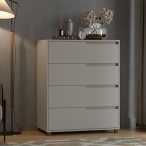 Uma cômoda 100% MDF de 15mm, possui 04 gavetas com corrediças telescópicas, puxadores usinados e pés antiumidade.