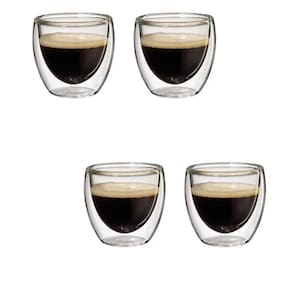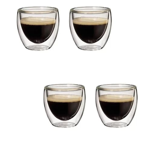 Quatro Copos em vidro borosilicato duplo, cafe cha, 80 ml Quatro copos de vidro com parede dupla. Alem do visual muito bonito, sem mantem mais quentinho.