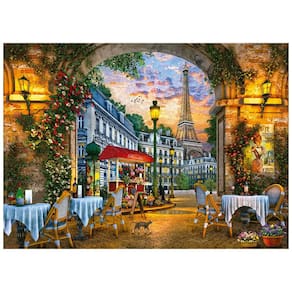 Descubra a magia do entardecer em Paris! A imagem captura a essência romântica da cidade, com a icônica Torre Eiffel ao fundo, um arco adornado com flores vibrantes e mesas convidativas para desfrutar de um vinho enquanto aprecia a vista deslumbrante..