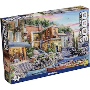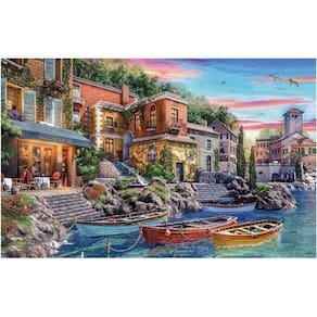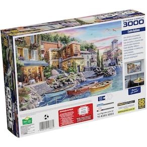 Viaje sem sair de casa com este quebra-cabeça que retrata o charme irresistível da costa italiana. A imagem revela um cenário à beira-mar onde casinhas coloridas e prédios charmosos se alinham sobre as rochas, enquanto pequenos barcos repousam nas águas calmas, à espera de seus donos.