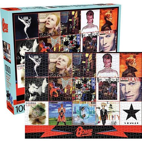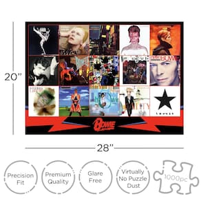 - Quebra-cabeça de 1000 peças: a arte de David Bowie é apresentada neste quebra-cabeça de 1000 peças que retrata algumas das adoradas capas do álbum de ícones musicais. O quebra-cabeça completo mede 50 x 71 cm