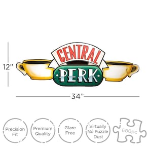- Quebra-cabeça dupla face em formato de 600 peças com a icônica placa Central Perk de um lado e uma colagem de 6 dos melhores amigos da cidade de Nova York. Você poderia se divertir mais? O quebra-cabeça completo mede 86 x 30 cm