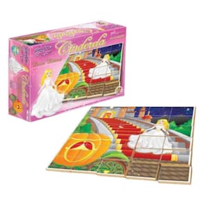 Quebra Cabeça Cinderela com 30 peças quebra cabeça em blocos estimula a aprendizagem, atenção, pensamento lógico e análise, e desenvolve a inteligência, memória e coordenação motora na criança.