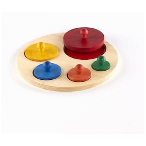 Conteúdo da embalagem: 1 base de madeira com recortes circulares, 5 círculos graduados com pinos coloridos e adesivos de codificação de cores