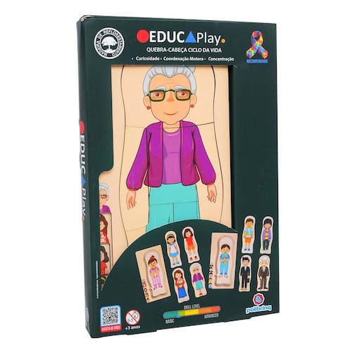 Neste jogo educativo encantador, as crianças exploram as fases do desenvolvimento humano de forma divertida e significativa. A montagem das peças estimula a compreensão das transformações físicas que ocorrem ao longo do tempo, despertando a empatia e promovendo reflexões sobre o crescimento, o envelhecimento e a diversidade de experiências. Além disso, o quebra-cabeça trabalha noções de sequência lógica e narrativa, desenvolvendo habilidades como raciocínio lógico, memória, concentração, coordenação motora fina e percepção visual. Com ilustrações envolventes e linguagem acessível, é uma ferramenta ideal para ampliar o vocabulário e promover conversas sobre a vida de maneira leve, respeitosa e cheia de descobertas. Uma verdadeira viagem pelo tempo, recheada de aprendizado e emoção!