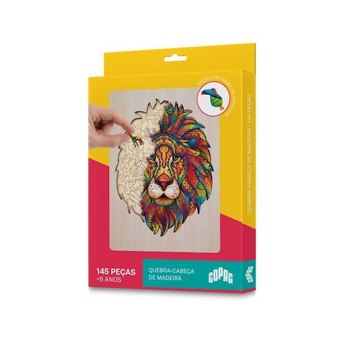 O Quebra-Cabeça de Madeira Leão da Copag é uma opção divertida e desafiadora para quem adora puzzles. Com 145 peças feitas de madeira de alta qualidade, este quebra-cabeça oferece uma experiência única e prazerosa de montagem. A ilustração do leão é detalhada e vibrante, criando um visual impressionante quando o puzzle é completado.