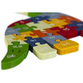 Quebra-cabeça educativo em formato de dinossauro Braquiossauro, com 26 peças coloridas. De um lado o alfabeto de A a Z, do outro a sequência de números de 1 a 26. Brinquedo confeccionado artesanalmente em madeira de reflorestamento e pintado com tinta atóxica. Nossos brinquedos são elaborados para atender diversas idades e feitos a mão com muito carinho