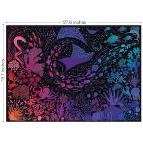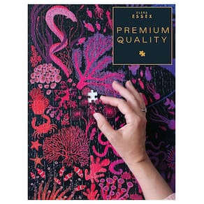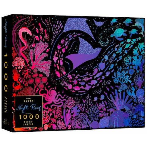 QUEBRA-CABEÇA DE ELENA ESSEX: Este colorido quebra-cabeça de 1000 peças apresenta uma caravana de criaturas marinhas girando sobre um recife de coral à noite. Cada peça do quebra-cabeça é cortada com precisão e tem um formato distinto de acordo com padrões exigentes, garantindo um ajuste confortável, seguro e robusto.