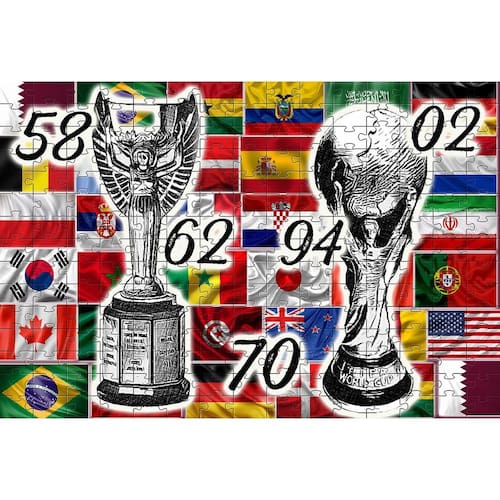 Quebra-cabeça temático com imagem de troféu de futebol, inspirado na edição de 2022. Produzido em MDF resistente, o produto conta com 120 peças e corte a laser, garantindo bom encaixe e durabilidade.