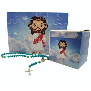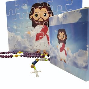 Quebra-cabeça Infantil Jesus Ressuscitado de 60 peças com Terço Especial O Quebra-Cabeça personalizado é um Ótimo passatempo, brinquedo e entretenimento para pais e filhos, jovens e adultos. Nossa nova linha de Quebra-Cabeças infantis com temas religiosos, nestes modelos apresentamos JESUS RESSUSCITADO de 60 peças, que a ser montado poderá ser colocado em um quadro decorativo em sua casa. Todos os quebra-cabeças desta linha possuem uma caixa exclusiva e diferenciada onde é colocada a imagem para a orientação da sua montagem, com informações, textos e oração do terço para acompanhar e aprender.