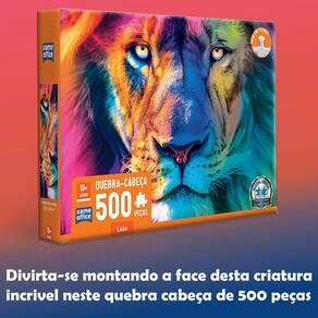 Quebra-cabeça de 500 peças para você montar a imponente face do leão. Temos um padrão internacional de qualidade e encaixe suave que pode ser sentido em cada peça