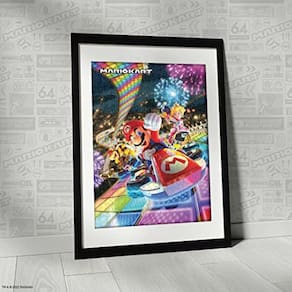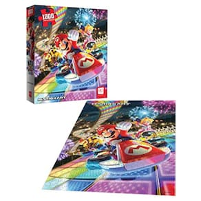 Brilhante, galáctico e na sua cara com toda a sua glória gradiente, Rainbow Road é uma pista inesquecível para os fãs de Mario Kart com este quebra-cabeça de 1.000 peças com o esteio de pernas para o ar do clássico jogo de corrida da Nintendo. Pegue a Princesa Peach carregando um Bob-omb enquanto Bowser alcança Mario entre outros detalhes neste quebra-cabeça fluorescente de 19 “x 27".