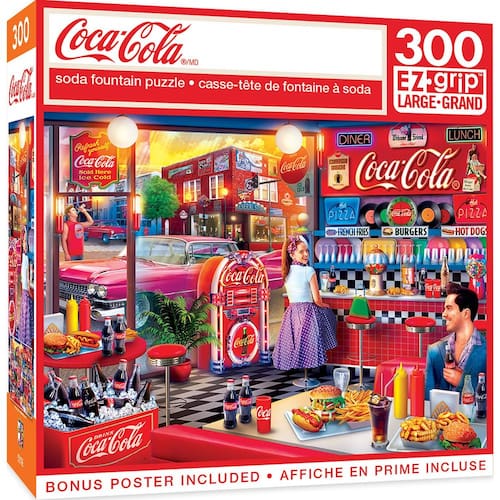 MasterPieces Quebra-cabeça EZ Grip de 300 peças - Fonte de refrigerante Coca-Cola - Diversão para toda a família - 45,7 cm x 61 cm - Peças extra grandes: Projetadas para facilitar a manipulação, nossas peças de quebra-cabeça EZ Grip são perfeitas para sessões de quebra-cabeça em família. - Design exclusivo: cada quebra-cabeça é cortado aleatoriamente a partir de padrões desenhados à mão, oferecendo um desafio novo e emocionante sempre. - Ecológico: Feito de materiais reciclados e impresso com tintas não tóxicas à base de soja para quebra-cabeças ecológicos. - Diversão desafiadora: Projetado para adultos, nossos quebra-cabeças oferecem uma experiência agradável e desafiadora para todos os níveis de habilidade. - Garantia de qualidade: Apoiado por nossa garantia de substituição de peças ausentes, garantindo uma experiência de quebra-cabeça premium para todas as idades.