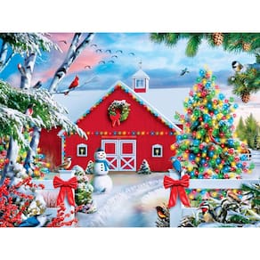 - Acabamento fosco — Nosso acabamento fosco ajuda a reduzir o brilho para uma melhor experiência de quebra-cabeça. Aqui está o que aparece nesta coleção Holiday Ez Grip - Linda imagem de um celeiro de Natal decorado com luzes brilhantes e um boneco de neve.