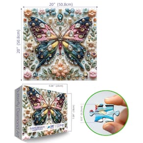 Mergulhe no mundo encantador deste quebra-cabeça de borboleta de 500 peças, com uma composição artística deslumbrante de uma borboleta majestosa adornada com elementos semelhantes a joias. O design complexo apresenta uma borboleta simétrica com asas decoradas em tons de azul, rosa, amarelo e roxo, embelezada com detalhes em forma de pérola e detalhes em estilo cristal. Ao redor da borboleta central há elementos florais delicados em tons suaves de pêssego e menta, criando um ambiente harmonioso semelhante a um jardim. Este quebra-cabeça oferece um desafio encantador para quebra-cabeças casuais e entusiastas, combinando a beleza da arte decorativa com a satisfação da montagem do quebra-cabeça. A peça acabada mede aproximadamente 50,8 x 50,8 cm, tornando-a perfeita para emoldurar, uma vez concluída. Cada peça é cortada com precisão para garantir um ajuste satisfatório, enquanto a impressão de alta qualidade captura todos os detalhes sutis do design ornamentado. Este quebra-cabeça oferece horas de entretenimento envolvente enquanto cria uma bela obra de arte que celebra a delicada beleza da natureza.