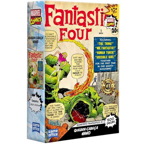 Descrição do produto : " Reviva o início de uma das equipes mais icônicas da Marvel com este quebra-cabeça de 500 peças em formato nano, da primeira edição do quadrinho do Quarteto Fantástico! Este quebra-cabeça vem com padrão internacional de qualidade e encaixe suave que pode ser sentido em cada peça! Imagem montada (aproximadamente) 22,3 x 31,3cm : "