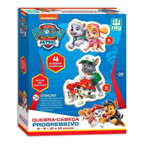 Quebra cabeça educativo super fofinho em madeira, fácil de montar e resistente. As crianças vão testar sua capacidade de concentração e memória, encaixando as pecinhas com os personagens da patrulha canina. Quebra cabeça progressivo 6,8,10,12 peças produto e licenciado pela nig brinquedos. Para a nig brinquedos é uma enorme satisfação oferecer ao seu cliente 60 anos de experiência, com muitas histórias de sucesso e comprometimento com as crianças. Toda linha de jogos e brinquedos da marca passa pela aprovação do inmetro instituto nacional de metrologia, normalização e qualidade industrial com a certificação do sgq sistema de gestão da qualidade . A nig oferece diversão, entretenimento e atividades pedagógicas com produtos de qualidade nas linhas de brinquedos, madeira, licenças, jogos, quebra-cabeças e eva. ---------------------------------------------------------- informações técnicas ---------------------------------------------------------- idade: 3+ país fabricante: brasil marca: nig brinquedos garantia: 30 dias contém: 36 peças em madeira