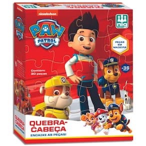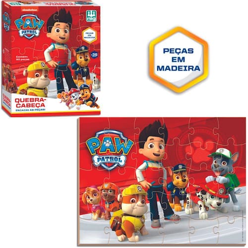 Quebra-Cabeça Patrulha Canina 30 Peças em MadeiraEsse quebra-cabeça traz uma linda imagem da Patrullha Canina!Vai encantar todos os fãs com o seu design cheio de detalhes e vibrante.Tem 30 peças em MDF, com alta qualidade de peças e de imagem, ele é bem colorido e divertido de montar.Cada peça é cortada para encaixar perfeitamente, proporcionando uma experiência suave e satisfatória.As crianças vão curtir muito depois de formar uma linda imagem dos Personagens da Patrulha Canina e podem guardar em sua coleção ou ser utilizado para decorar sua parede com muito estilo!ESPECIFICAÇÕES DO PRODUTO:Idade Recomendada: Recomendado para crianças maiores de 3 anos.Conteúdo da Embalagem: 30 Peças em Madeira para Montar o Quebra-CabeçaMaterial: Madeira MDFDimensões do Quebra Cabeça Montado: 34 x 26cmDimensões da Embalagem EM PÉ: 20x6x25cm (CxLxA)