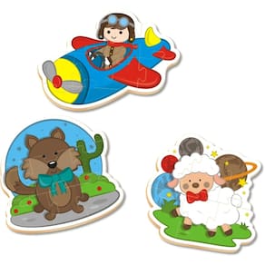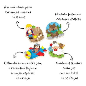 Contém 30 peças grandes em madeira, formando 04 ilustrações fofas.