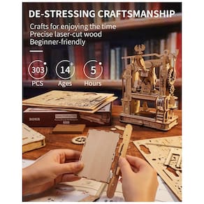 Este quebra cabeça 3D contém 303 peças, um manual de instruções ilustrado, lista de peças, chave de fenda, mola e carimbos de borracha. Os carimbos incluem números, kaomoji e várias pinturas de desenhos animados, permitindo uma ampla variedade de escolhas. A caixa de tinta à base de água e as 20 folhas de papel de escrita de 8 cm x 5 cm podem ser armazenadas na gaveta inferior da máquina. A montagem do quebra cabeça requer 5 horas de paciência, mas o resultado é uma impressora clássica adequada para coleção.