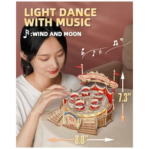 O ROKR LED Wooden Music Box Kit oferece uma experiência única com suas Xícaras de Chá Giratórias, um quebra-cabeça 3D de madeira que leva aproximadamente 5,5 horas para ser concluído. Ao pressionar o botão, as luzes se acendem e a música começa a tocar, enquanto os mini assentos giram automaticamente, proporcionando um encanto especial.
