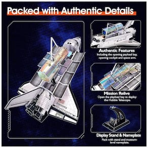 Explore o universo com o conjunto de construção do ônibus espacial da NASA, que inclui detalhes autênticos do Discovery, a nave que implantou o Telescópio Espacial Hubble. Este modelo realista vem com um suporte de exibição e é uma peça central atraente para a casa ou o escritório. É o presente perfeito para adultos e crianças interessados na exploração espacial e na história da NASA. As instruções ilustradas em 3D e os materiais seguros e duráveis garantem uma montagem fácil e envolvente, tornando o um item obrigatório para qualquer colecionador ou entusiasta do espaço. Tamanho de construção é 49 cm x 30 cm x 33 cm.