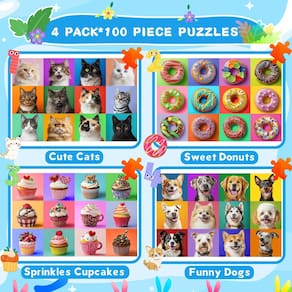 - Pacote econômico com 4 quebra-cabeças de 100 peças para crianças: este conjunto de quebra-cabeça design especial para crianças, 4 temas ricos incluem cães engraçados, gatos fofos, rosquinhas doces e cupcakes granulados. Cores brilhantes e design exclusivo de grade 12 capturam o coração das crianças, mantendo seu filho envolvido por horas. Perfeito para quebra-cabeças para crianças de 4 a 6 anos, quebra-cabeças para crianças de 6 a 8 anos