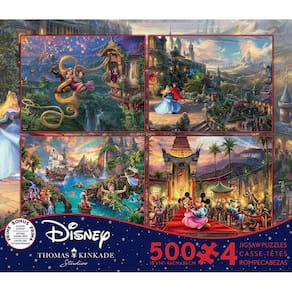 PRODUTO INTERNACIONAL. Experimente a magia da Disney como nunca antes com o multipack Disney Dreams da Thomas Kinkade! Com quatro quebra-cabeças magníficos, este pacote é uma adição deslumbrante a qualquer coleção de quebra-cabeça. Viva aventuras emocionantes com Tangled, Sleeping Beauty, Peter Pan e Mickey e Minnie enquanto você deslumbra-se com a bela arte do mundialmente famoso Thomas Kinkade