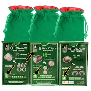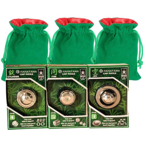 - 3 quebra-cabeças interligados de metal fundido, cor de cromo, da Hanayama Puzzles of Japan. Inclui tubo, cilindro e OVNI. Pequeno, compacto, de bolso. Cada um pesa aproximadamente 3 onças e mede de 1 a 1,5 polegadas em seu lado comprido.