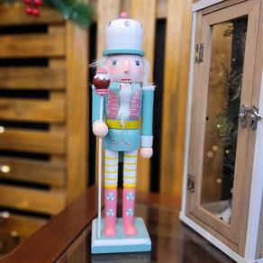 Adicione um toque lúdico e festivo à sua decoração com este boneco quebra-nozes temático no estilo candy! Com 30 cm de altura, ele é confeccionado em madeira e pintado em vibrantes tons de verde, rosa e lilás, proporcionando charme e cor à sua decoração natalina. Sua boca articulada é um detalhe clássico que traz autenticidade à peça.