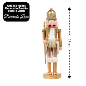 Adicione tradição e elegância à sua decoração natalina com o Quebra-Nozes Decorativo Dourado Luxo com Bastão Estrela, uma peça clássica que traz charme e sofisticação para qualquer ambiente. Com 28cm de altura, este enfeite é perfeito para complementar aparadores, mesas, prateleiras, guirlandas ou a base da árvore de Natal.