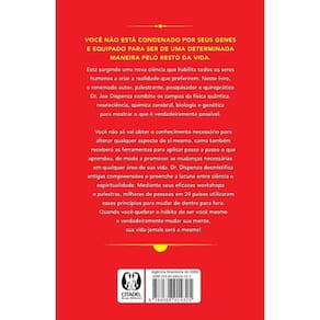 Você não está condenado por seus genes e equipado para ser de uma determinada maneira pelo resto da vida. Está surgindo uma nova ciência que habilita todos os seres humanos a criar a realidade que preferirem. Neste livro, o renomado autor, palestrante, pesquisador e quiroprático Dr. Joe Dispenza combina os campos da física quântica, neurociência, química cerebral, biologia e genética para mostrar o que é verdadeiramente possível. Você não só vai obter o conhecimento necessário para alterar qualquer aspecto de si mesmo, como também receberá as ferramentas para aplicar passo a passo o que aprendeu, de modo a promover as mudanças necessárias em qualquer área de sua vida. Dr. Joe desmistifica antigas compreensões e preenche a lacuna entre ciência e espiritualidade. Quando você quebrar o hábito de ser você mesmo e verdadeiramente mudar sua mente, sua vida jamais será a mesma!