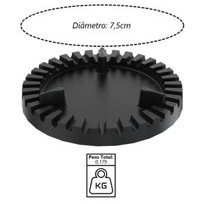Características Técnicas Espalha Chama Menor:Material: Ferro Fundido.Diâmetro Total: 7,5cm.Peso: 0,179Kg.