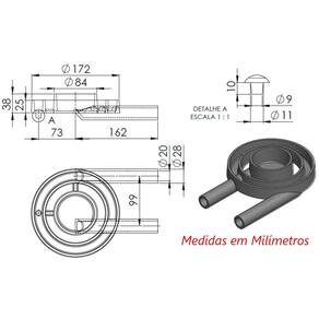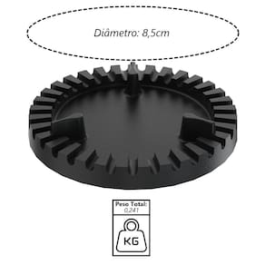 Características Técnicas Queimador:Comprimento do Cano: 16,2cm.Diâmetro do Bocal: 2cm.Material: Ferro Fundido.Diâmetro Total: 17,2cm.Peso: 2,173Kg.Altura: 3,8cm.